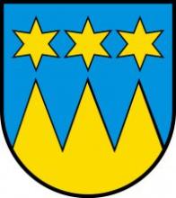 In Blau drei gelbe Spitzen, überhöht von drei sechsstrahligen gelben Sternen.